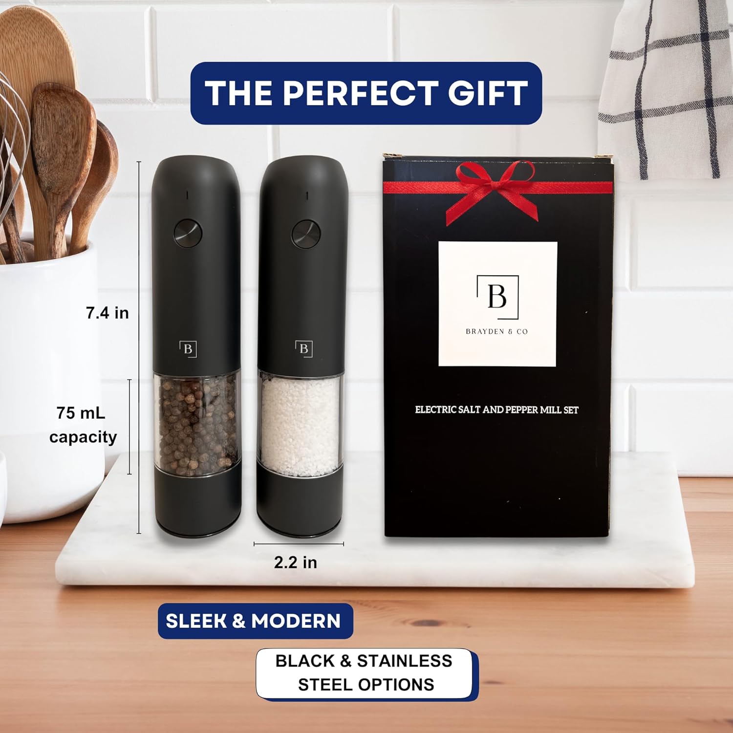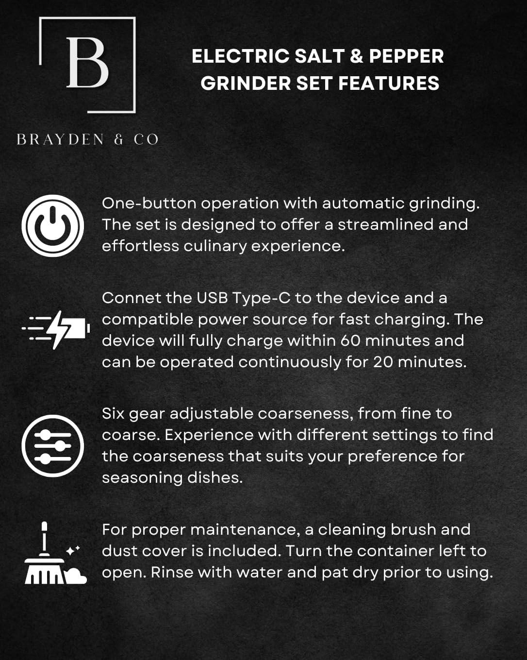Introducing the Brayden & Co Electric Salt and Pepper Grinder Set – a statement piece for your kitchen. This set includes two large capacity grinders, a USB Type-C charger cable, a brush, and a manual (Note: salt and pepper not included).